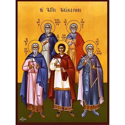 Εικόνα Ορθοδοξίας με περίγραμμα χρυσό σε ξύλο Φλαμουρίας με βάση Εικόνα ΑΓΙΟΙ ΑΚΙΝΔΥΝΟΣ, ΠΗΓΑΣΙΟΣ, ΑΦΘΟΝΙΟΣ, ΕΛΠΙΔΗΦΟΡΟΣ ΚΑΙ ΑΝΕΜΠΟΔΙΣΤΟΣ, ΜΑΡΤΥΡΕΣ Χειροποίητη Ελληνορθόδοξη εικόνα του Ιησού Χριστού, Κρεμαστή πλάκα βυζαντινής τέχνης, χριστιανική τέχνη Δ