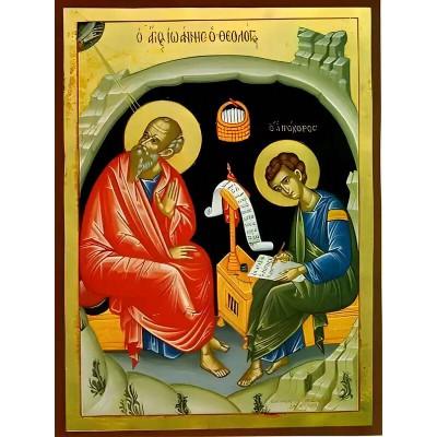 Όνομα Προϊόντος Εικόνα Ορθοδοξίας με περίγραμμα χρυσό σε ξύλο Φλαμουρίας με βάση Εικόνα ΑΓΙΟΣ ΑΠΟΣΤΟΛΟΣ ΚΑΙ ΕΥΑΓΓΕΛΙΣΤΗΣ ΙΩΑΝΝΗΣ Ο ΘΕΟΛΟΓΟΣ ΚΑΙ ΑΓΙΟΣ ΑΠΟΣΤΟΛΟΣ ΠΡΟΧΟΡΟΣ ΣΕ ΣΠΗΛΑΙΟ, ΟΛΟΣΩΜΟΙ Χειροποίητη Ελληνορθόδοξη εικόνα του Ιησού Χριστού, Κρεμαστή πλάκα βυζαντινής τ