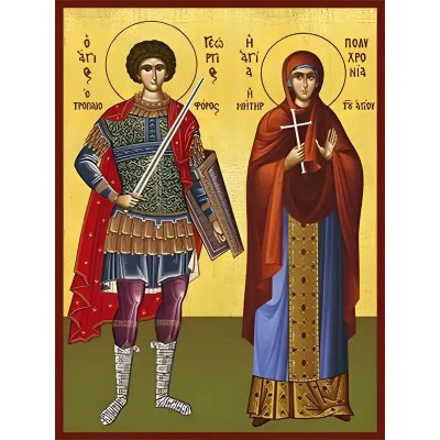 Εικόνα Ορθοδοξίας με περίγραμμα χρυσό σε ξύλο Φλαμουρίας με βάση Εικόνα ΑΓΙΟΣ ΓΕΩΡΓΙΟΣ Ο ΤΡΟΠΑΙΟΦΟΡΟΣ ΚΑΙ ΑΓΙΑ ΠΟΛΥΧΡΟΝΙΑ, Η ΜΗΤΗΡ ΑΥΤΟΥ, ΟΛΟΣΩΜΟΙ Χειροποίητη Ελληνορθόδοξη εικόνα του Ιησού Χριστού, Κρεμαστή πλάκα βυζαντινής τέχνης, χριστιανική τέχνη Δι