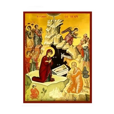 Βασικά Χαρακτηριστικά: - Σχέδιο: Κλασική βυζαντινή εικονογραφία με ζωηρό κόκκινο περίγραμμα - Υλικό: Ξύλο Μασίφ Φλαμουρία υψηλής αντοχής με προστατευτικό βερνίκι για ποιότητα που διαρκεί - Προέλευση: Χειροποίητο στην Ελλάδα - Σκοπός: Ιδανικό για γωνιές προσευχής, εκκλησίες, διακόσμηση σπιτιού ή ως δώρο με νόημα Διαθέσιμα μεγέθη: 10x7 cm (3,9 x 2,8 ίντσες) 15x11 cm (5,9 x 4,3 ίντσες) 21x15 cm (8,3 x 5,9 ίντσες) 26x20 cm (10,2 x 7,9 ίντσες) 40x30 cm (15,8 x 11,8 ίντσες) 45x35 cm (17,7 x 13,8 ίντσες) 50x40 cm (19,7 x 15,8 ίντσες)► Εικόνα της Γέννησης του Χριστού ξύλινη.  Χειροποίητη ξύλινη εικόνα, ειδικής επεξεργασίας  σε σκληρό Φλαμουριά Ξύλο Εικόνα Ορθόδοξης τέχνης, σκαλισμένη ή τυπωμένη σε ξύλο φλαμουριάς υψηλής ποιότητας. Η φυσική απαλότητα και ομοιομορφία του ξύλου τονίζει κάθε λεπτομέρεια του εικονίσματος, αναδεικνύοντας τη βαθιά πνευματικότητα και την ιερότητα της παράδοσης. Ιδανική για οικιακό εικονοστάσι, δώρο βάπτισης, γάμου ή αφιέρωμα σε ναό. Το ξύλο έχει υποστεί ειδική επεξε
