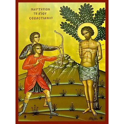 Σετ των 2 Εικόνα Ορθοδοξίας με περίγραμμα χρυσό σε ξύλο Φλαμουρίας με βάση Εικόνα ΑΓΙΟΣ ΣΕΒΑΣΤΙΑΝΟΣ: ΤΟ ΜΑΡΤΥΡΙΟΝ Χειροποίητη Ελληνορθόδοξη εικόνα του Ιησού Χριστού, Κρεμαστή πλάκα βυζαντινής τέχνης, χριστιανική τέχνη Διάσταση 15x11 cm (5,9x4,3 ίντσες)