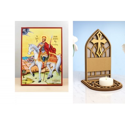 Σετ 2 τεμαχίων – Εικόνα Ορθοδοξίας Καντηλάκι σε 8 χρώματα με περίγραμμα χρυσό σε ξύλο Plywood (Πλακάζ) με βάση Ο Άγιος Κωνσταντίνος ο Μέγας έφιππος, Ξύλινη Χειροποίητη Εικόνα Ελληνικής Premium Βυζαντινού Στυλ Κρεμαστή σε ξύλινη πλάκα Χειροποίητη Ελλην