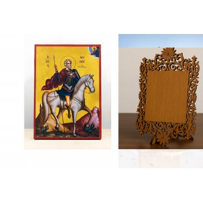 | Όνομα Προϊόντος | Σετ 2 τεμαχίων – Εικόνα Ορθοδοξίας Δαντέλα μαζι με Βάση σε 8 χρώματα με περίγραμμα χρυσό σε ξύλο Plywood (Πλακάζ) με βάση Άγιος Μηνάς της Αιγύπτου έφιππος, Ξύλινη Χειροποίητη Εικόνα Ελληνικής Premium Βυζαντινής τεχνοτροπίας Κρεμασμένη σε ξύλινη πλάκα |