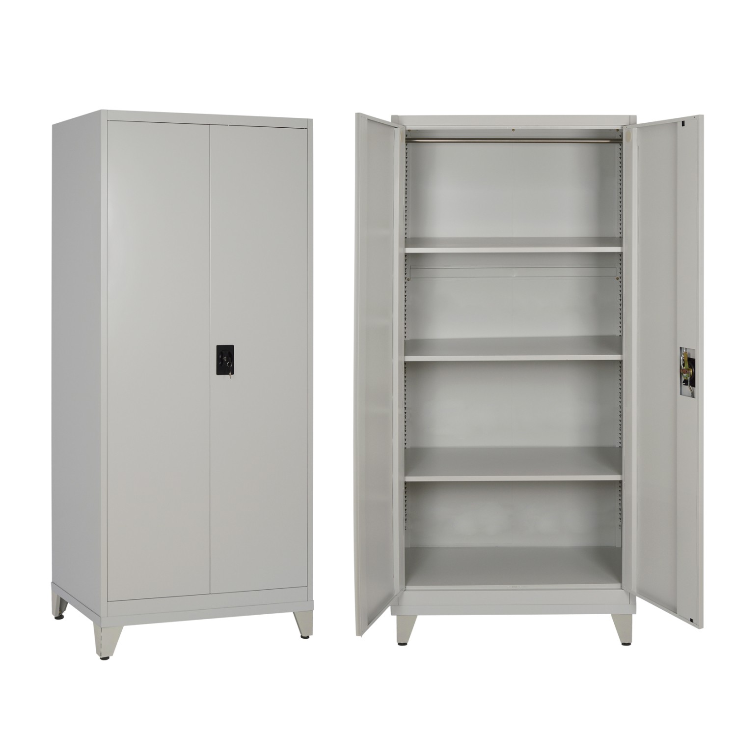 Η ντουλάπα διαθέτει δύο πόρτες με κλειδαριά για ασφαλή φύλαξη αντικειμένων και τρία ρυθμιζόμενα ράφια, ώστε να προσαρμόζεται εύκολα στις ανάγκες σας — ιδανική για εργαλεία, φακέλους, ρούχα ή εξοπλισμό. Επιπροσθέτως, διαθέτει και πόδια ύψους 10 εκατοστών με ρυθμιστές ύψους για εσάς που θέλετε η ντουλάπα να μην «πατάει» απευθείας στο δάπεδο.