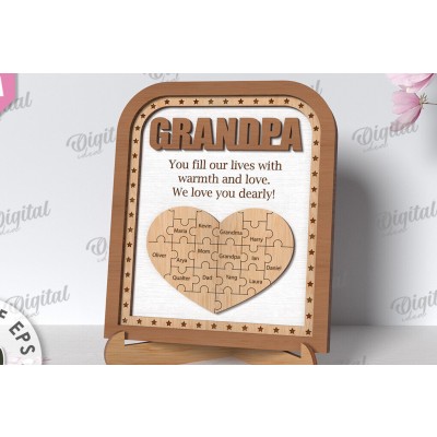Πλαίσιο παππού παζλ Κοπή λέιζερ Πρόκειται για ψηφιακό σχεδίου, ιδανικό για κοπή με ή plotter. Κατασκευασμένο απο Ξύλο από plywood [3mm ή 4mm], κομμένο με ακρίβεια στην βιοτεχνία Intrahome . Το φυσικό ξύλο προσφέρει μια κομψή, αυθεντική υφή και μπορεί εύκολα να βαφτεί ή να διακοσμηθεί σύμφωνα με το προσωπικό σας γούστο. Ελληνική παραγωγή – Κατασκευάζεται στην Ελλάδα με προσοχή στη λεπτομέρεια και υψηλές προδιαγραφές ποιότητας. ✔️ Υλικό: Plywood υψηλής ποιότητας ✔️ Διατίθεται σε πάχος 3mm ή 4mm ✔️ Ελαφρύ, ανθεκτικό και εύκολο στη χρήση ✔️ Ιδανικό για βάψιμο, χάραξη, κόλληση και χειροτεχνίες ✔️ Κατάλληλο για μπομπονιέρες, διακόσμηση, δώρα και DIY projects ✅ Εγγύηση 2 ετών – Σε περίπτωση σπασίματος, η αντικατάσταση γίνεται άμεσα, χάρη στην τοπική ελληνική παραγωγή μας. Ιδανικό για δημιουργικούς ανθρώπους που αγαπούν το DIY. Μπορεί να γίνει ξεχωριστό δώρο με προσωπικό χαρακτήρα. Φέρνει “χειροποίητη” αισθητική στη διακόσμηση. -files- Ελληνική χειροποίητη παραγωγή → στηρίζετε το