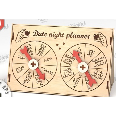 Date Night Spinner Planner Laser Cut Πρόκειται για ψηφιακό σχεδίου, ιδανικό για κοπή με ή plotter. Κατασκευασμένο απο Ξύλο από plywood [3mm ή 4mm], κομμένο με ακρίβεια στην βιοτεχνία Intrahome . Το φυσικό ξύλο προσφέρει μια κομψή, αυθεντική υφή και μπορεί εύκολα να βαφτεί ή να διακοσμηθεί σύμφωνα με το προσωπικό σας γούστο. Ελληνική παραγωγή – Κατασκευάζεται στην Ελλάδα με προσοχή στη λεπτομέρεια και υψηλές προδιαγραφές ποιότητας. ✔️ Υλικό: Plywood υψηλής ποιότητας ✔️ Διατίθεται σε πάχος 3mm ή 4mm ✔️ Ελαφρύ, ανθεκτικό και εύκολο στη χρήση ✔️ Ιδανικό για βάψιμο, χάραξη, κόλληση και χειροτεχνίες ✔️ Κατάλληλο για μπομπονιέρες, διακόσμηση, δώρα και DIY projects ✅ Εγγύηση 2 ετών – Σε περίπτωση σπασίματος, η αντικατάσταση γίνεται άμεσα, χάρη στην τοπική ελληνική παραγωγή μας. Ιδανικό για δημιουργικούς ανθρώπους που αγαπούν το DIY. Μπορεί να γίνει ξεχωριστό δώρο με προσωπικό χαρακτήρα. Φέρνει “χειροποίητη” αισθητική στη διακόσμηση. -files- Ελληνική χειροποίητη παραγωγή → στηρίζε
