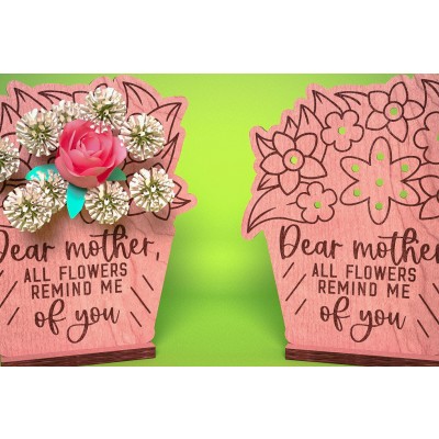 Flowers Holder για τη γιορτή της μητέρας Κοπή με λέιζερ Πρόκειται για ψηφιακό σχεδίου, ιδανικό για κοπή με ή plotter. Κατασκευασμένο απο Ξύλο από plywood [3mm ή 4mm], κομμένο με ακρίβεια στην βιοτεχνία Intrahome . Το φυσικό ξύλο προσφέρει μια κομψή, αυθεντική υφή και μπορεί εύκολα να βαφτεί ή να διακοσμηθεί σύμφωνα με το προσωπικό σας γούστο. Ελληνική παραγωγή – Κατασκευάζεται στην Ελλάδα με προσοχή στη λεπτομέρεια και υψηλές προδιαγραφές ποιότητας. ✔️ Υλικό: Plywood υψηλής ποιότητας ✔️ Διατίθεται σε πάχος 3mm ή 4mm ✔️ Ελαφρύ, ανθεκτικό και εύκολο στη χρήση ✔️ Ιδανικό για βάψιμο, χάραξη, κόλληση και χειροτεχνίες ✔️ Κατάλληλο για μπομπονιέρες, διακόσμηση, δώρα και DIY projects ✅ Εγγύηση 2 ετών – Σε περίπτωση σπασίματος, η αντικατάσταση γίνεται άμεσα, χάρη στην τοπική ελληνική παραγωγή μας. Ιδανικό για δημιουργικούς ανθρώπους που αγαπούν το DIY. Μπορεί να γίνει ξεχωριστό δώρο με προσωπικό χαρακτήρα. Φέρνει “χειροποίητη” αισθητική στη διακόσμηση. -files- Ελληνική χειροποίητη