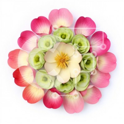 Υπάρχει δυνατότητα προσωποποίησης με δική σας φωτογραφία και προσαρμογής διαστάσεων κατόπιν παραγγελίας. Το συγεκεριμενο Puzzle 10x10 cm – 25 κομμ παρουσιαζει Η εικόνα παρουσιάζει μια όμορφα διαρρυθμισμένη σύνθεση από διάφορα λουλούδια σε λευκό φόντο. Τα άνθη είναι κυρίως σε αποχρώσεις του ροζ και του πράσινου, σχηματίζοντας ένα κυκλικό σχέδιο με εμφανές κεντρικό λουλούδι που είναι ανοιχτό κίτρινο