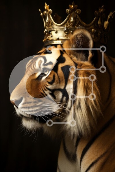 Υπάρχει δυνατότητα προσωποποίησης με δική σας φωτογραφία και προσαρμογής διαστάσεων κατόπιν παραγγελίας. Το συγεκεριμενο Puzzle 10x10 cm – 25 κομμ παρουσιαζει Αυτή η εικόνα παρουσιάζει μια μεγαλοπρεπή τίγρη στολισμένη με ένα χρυσό στέμμα, που επιδεικνύει τις εντυπωσιακές ρίγες και την ισχυρή παρουσία της. Το προφίλ της τίγρης αποτυπώνεται σε σκούρο φόντο, το οποίο αναδεικνύει τη λεπτομερή γούνα κα
