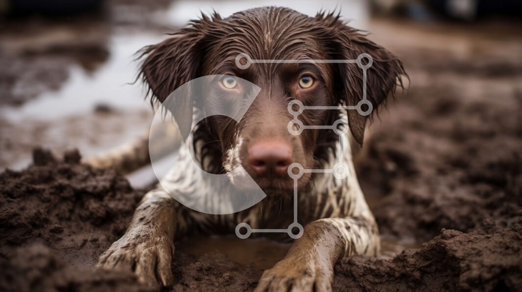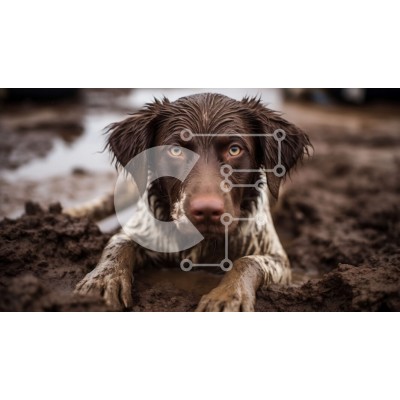 Υπάρχει δυνατότητα προσωποποίησης με δική σας φωτογραφία και προσαρμογής διαστάσεων κατόπιν παραγγελίας. Το συγεκεριμενο Puzzle 10x10 cm – 25 κομμ παρουσιαζει Αυτή η εικόνα δείχνει έναν καφέ και λευκό σκύλο να ξεκουράζεται στη λάσπη. Το βρεγμένο και μπερδεμένο τρίχωμα του σκύλου, τα ορθάνοιχτα μάτια και το ανοιχτό στόμα του σκύλου υποδηλώνουν βαρύ λαχάνιασμα. Με ψηλά αυτιά και κουνημένη ουρά, ο σκ