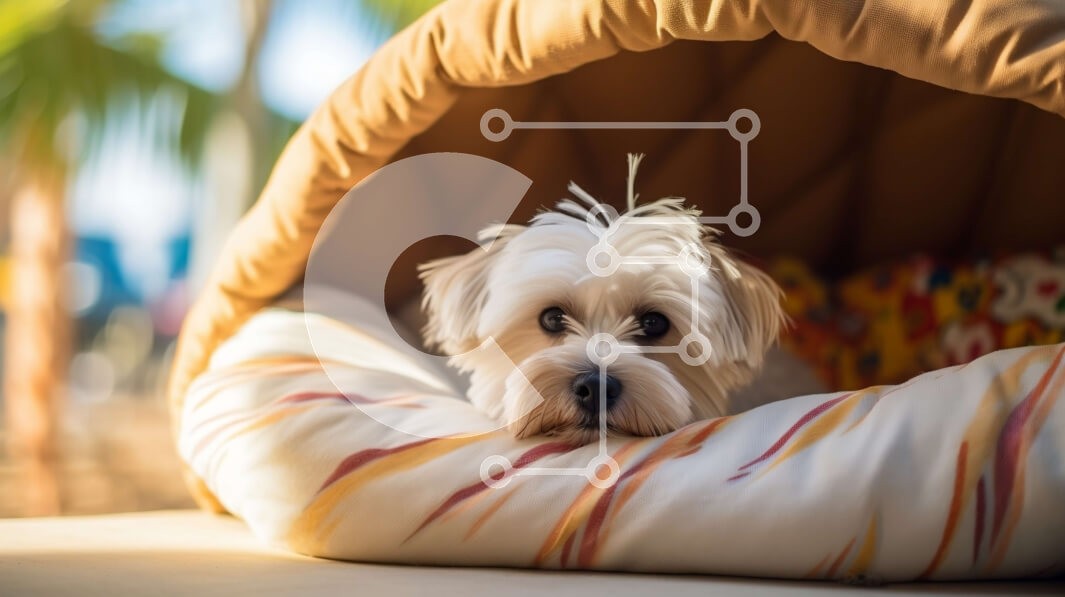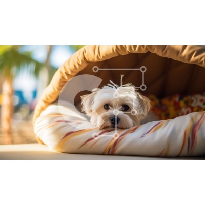 Υπάρχει δυνατότητα προσωποποίησης με δική σας φωτογραφία και προσαρμογής διαστάσεων κατόπιν παραγγελίας. Το συγεκεριμενο Puzzle 10x10 cm – 25 κομμ παρουσιαζει Αυτή η εικόνα δείχνει ένα μικρό λευκό σκυλί ξαπλωμένο σε ένα κρεβάτι από μαξιλάρια και κουβέρτες. Ο σκύλος κοιτάζει ψηλά στην κάμερα και φοράει ένα κολάρο. Το φόντο αποτελείται από έναν ανοιχτόχρωμο τοίχο με φοίνικες σε απόσταση. Ένα μοναδι