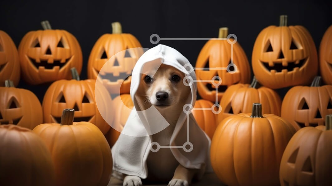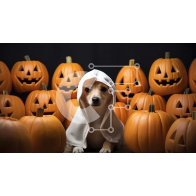 Υπάρχει δυνατότητα προσωποποίησης με δική σας φωτογραφία και προσαρμογής διαστάσεων κατόπιν παραγγελίας. Το συγεκεριμενο Puzzle 10x10 cm – 25 κομμ παρουσιαζει Αυτή η εικόνα παρουσιάζει ένα αξιολάτρευτο μικρό σκυλί που φορά μια στολή φαντασμάτων. Ο σκύλος περιβάλλεται από πολλές κολοκύθες, δημιουργώντας μια εορταστική σκηνή με θέμα το Halloween. Το κεφάλι του σκύλου είναι γερμένο στο πλάι και η ουρ
