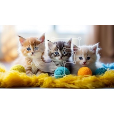 Υπάρχει δυνατότητα προσωποποίησης με δική σας φωτογραφία και προσαρμογής διαστάσεων κατόπιν παραγγελίας. Το συγεκεριμενο Puzzle 10x10 cm – 25 κομμ παρουσιαζει Αυτή η εικόνα παρουσιάζει τρία γατάκια που κάθονται σε μια κίτρινη κουβέρτα με πολύχρωμες μπάλες από νήμα. Κοιτάζουν την κάμερα, φαινομενικά απολαμβάνουν τον χρόνο τους μαζί. Μπορεί να παίζουν με το νήμα ή να εξερευνούν το περιβάλλον τους.