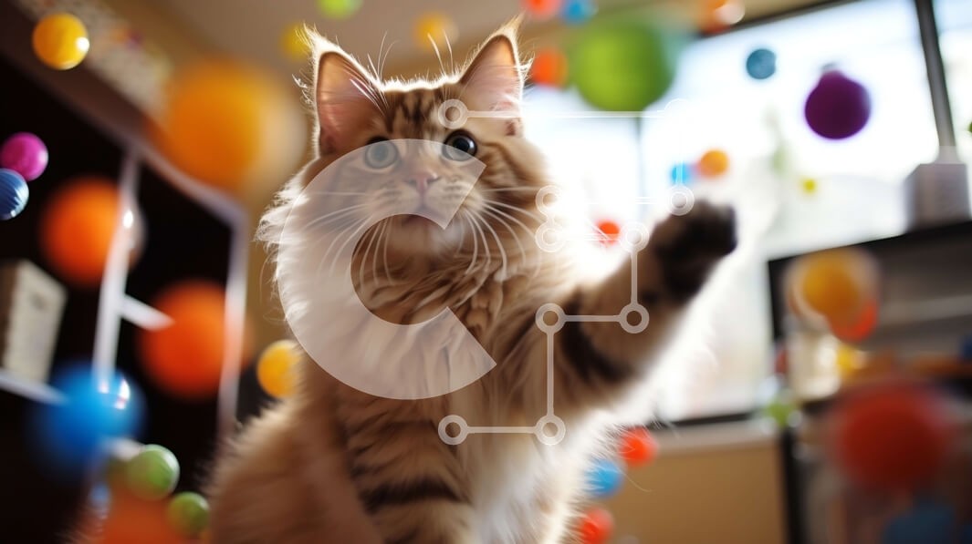 Υπάρχει δυνατότητα προσωποποίησης με δική σας φωτογραφία και προσαρμογής διαστάσεων κατόπιν παραγγελίας. Το συγεκεριμενο Puzzle 10x10 cm – 25 κομμ παρουσιαζει Αυτή η εικόνα παρουσιάζει μια χνουδωτή, μακρυμάλλη γάτα να στέκεται σε ένα δάπεδο με μοκέτα. Τα μπροστινά πόδια της γάτας είναι ανασηκωμένα καθώς κοιτάζει ψηλά τις πολύχρωμες μπάλες που κρέμονται από την οροφή. Το δωμάτιο είναι ζωντανό και γ