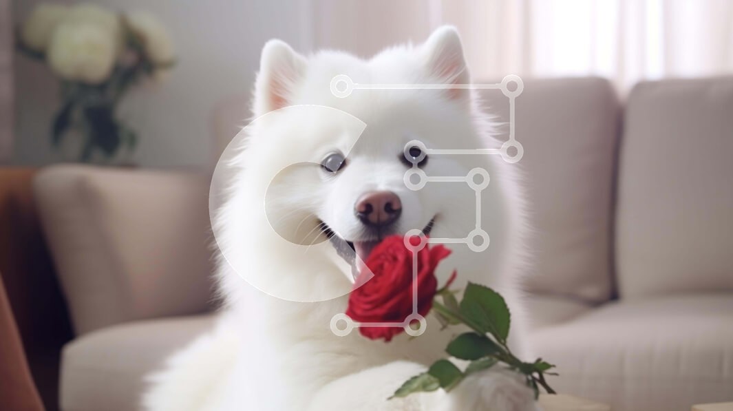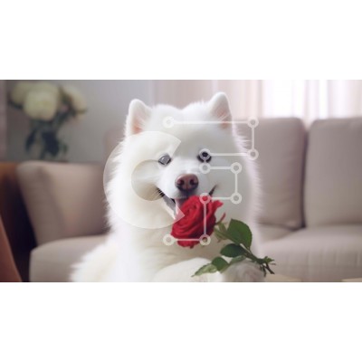 Υπάρχει δυνατότητα προσωποποίησης με δική σας φωτογραφία και προσαρμογής διαστάσεων κατόπιν παραγγελίας. Το συγεκεριμενο Puzzle 10x10 cm – 25 κομμ παρουσιαζει Αυτή η εικόνα παρουσιάζει έναν λευκό σκύλο να κάθεται σε έναν καναπέ, κρατώντας μια διάταξη από κόκκινα τριαντάφυλλα στο στόμα του. Ο σκύλος φαίνεται να απολαμβάνει τα λουλούδια καθώς τα κοιτάζει με στοργή. Είναι μια συγκλονιστική σκηνή που