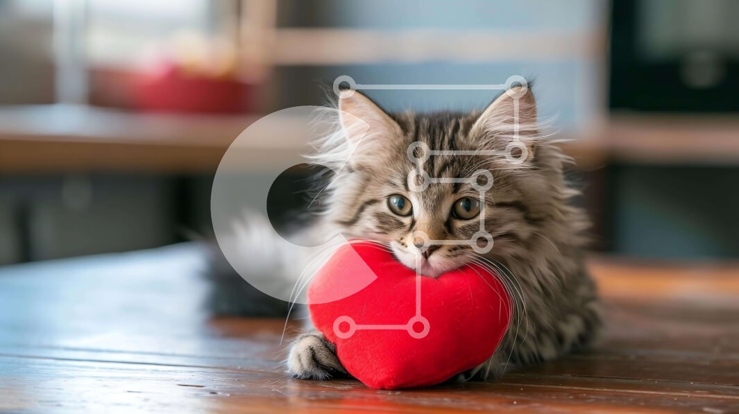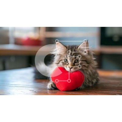 Υπάρχει δυνατότητα προσωποποίησης με δική σας φωτογραφία και προσαρμογής διαστάσεων κατόπιν παραγγελίας. Το συγεκεριμενο Puzzle 10x10 cm – 25 κομμ παρουσιαζει Η εικόνα απεικονίζει μια μικρή, γκρι και λευκή γάτα ξαπλωμένη σε ένα τραπέζι με το στόμα ανοιχτό, κρατώντας ένα κόκκινο μαξιλάρι σε σχήμα καρδιάς. Η γάτα φαίνεται να παίζει με το μαξιλάρι, αποπνέοντας έναν αέρα παιχνιδιού και ικανοποίησης.
