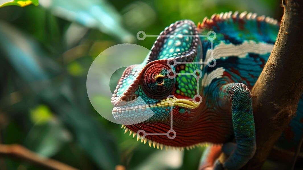 Υπάρχει δυνατότητα προσωποποίησης με δική σας φωτογραφία και προσαρμογής διαστάσεων κατόπιν παραγγελίας. Το συγεκεριμενο Puzzle 10x10 cm – 25 κομμ παρουσιαζει Αυτή η κοντινή εικόνα παρουσιάζει έναν πολύχρωμο χαμαιλέοντα σκαρφαλωμένο στο κλαδί μιας βελανιδιάς. Ο χαμαιλέοντας φαίνεται να στηρίζεται στην πλάτη του, με το κεφάλι του να γέρνει προς την κάμερα. Τα ζωηρά χρώματα του σώματος και του προσώ