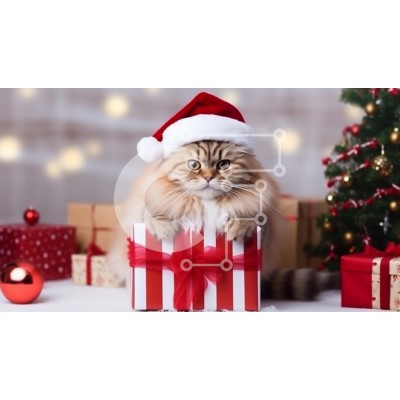 Υπάρχει δυνατότητα προσωποποίησης με δική σας φωτογραφία και προσαρμογής διαστάσεων κατόπιν παραγγελίας. Το συγεκεριμενο Puzzle 10x10 cm – 25 κομμ παρουσιαζει Η εικόνα απεικονίζει μια χνουδωτή γάτα που φορά ένα καπέλο Άγιου Βασίλη, σκαρφαλωμένη σε ένα ριγέ κουτί δώρου. Το φόντο είναι διακοσμημένο με ένα χριστουγεννιάτικο δέντρο στολισμένο με στολίδια και φωτάκια, δίπλα σε κουτιά δώρων διάσπαρτα τρ