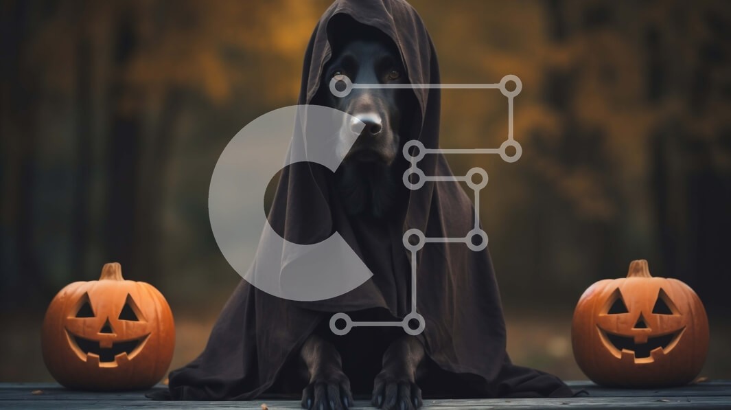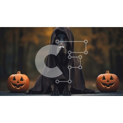 Υπάρχει δυνατότητα προσωποποίησης με δική σας φωτογραφία και προσαρμογής διαστάσεων κατόπιν παραγγελίας. Το συγεκεριμενο Puzzle 10x10 cm – 25 κομμ παρουσιαζει Αυτή η εικόνα δείχνει έναν μαύρο σκύλο που φορά έναν μανδύα με κουκούλα και κάθεται μπροστά σε δύο κολοκύθες. Το πρόσωπο του σκύλου δεν φαίνεται, αλλά φαίνεται να φοράει μια χαρούμενη έκφραση. Το φόντο είναι μια δασώδης περιοχή με ορατά δέντ