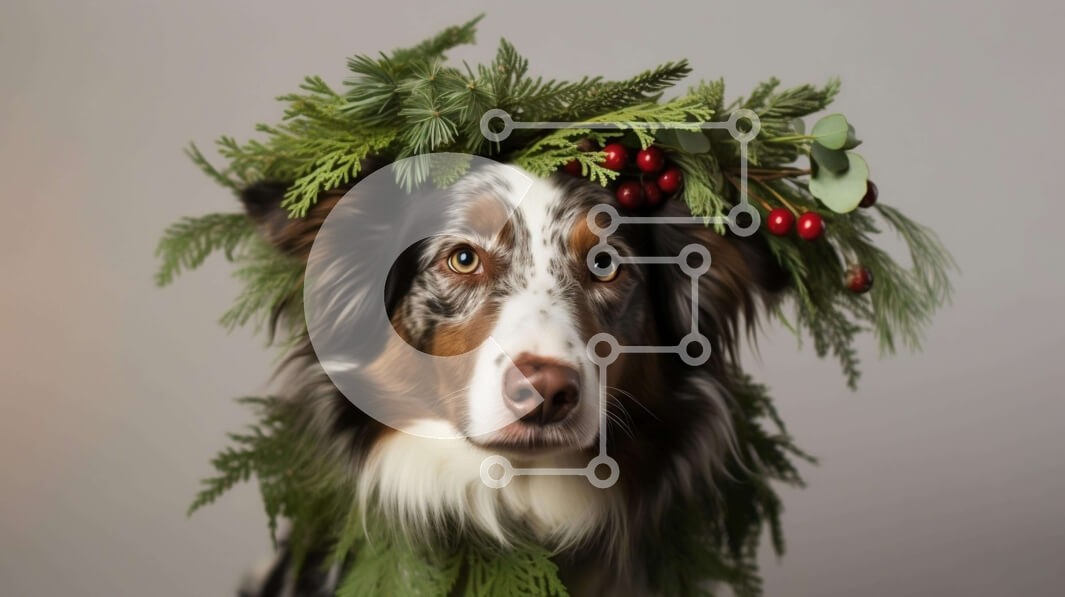 Υπάρχει δυνατότητα προσωποποίησης με δική σας φωτογραφία και προσαρμογής διαστάσεων κατόπιν παραγγελίας. Το συγεκεριμενο Puzzle 10x10 cm – 25 κομμ παρουσιαζει Αυτή η εικόνα παρουσιάζει έναν καφέ και λευκό σκύλο με ένα διακοσμητικό στεφάνι στο κεφάλι του. Το στεφάνι είναι διακοσμημένο με πράσινα φύλλα και κόκκινα μούρα, προσθέτοντας μια εορταστική πινελιά. Ο σκύλος κοιτάζει την κάμερα και φαίνεται