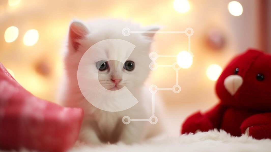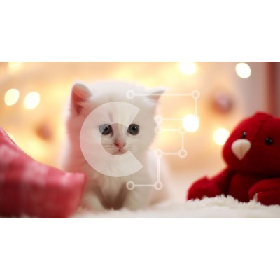 Υπάρχει δυνατότητα προσωποποίησης με δική σας φωτογραφία και προσαρμογής διαστάσεων κατόπιν παραγγελίας. Το συγεκεριμενο Puzzle 10x10 cm – 25 κομμ παρουσιαζει Αυτή η εικόνα απεικονίζει ένα μικρό λευκό γατάκι να κάθεται στο έδαφος, με τα μάτια του ορθάνοιχτα. Συνοδεύοντας το γατάκι είναι ένα κόκκινο αρκουδάκι, που υποδηλώνει ένα περιποιητικό περιβάλλον. Η σκηνή στολίζεται με φώτα και διακοσμητικά,