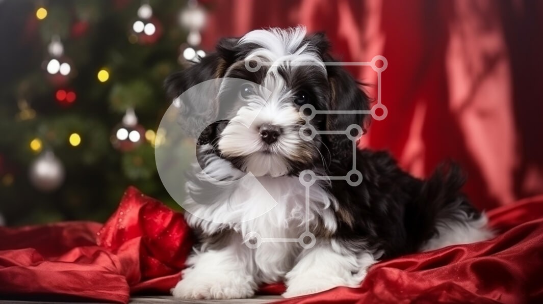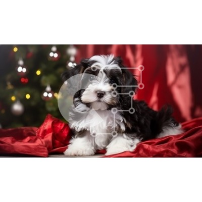 Υπάρχει δυνατότητα προσωποποίησης με δική σας φωτογραφία και προσαρμογής διαστάσεων κατόπιν παραγγελίας. Το συγεκεριμενο Puzzle 10x10 cm – 25 κομμ παρουσιαζει Η εικόνα απεικονίζει ένα αξιολάτρευτο κουτάβι με ένα χνουδωτό ασπρόμαυρο παλτό, που κάθεται σε ένα κόκκινο σατέν ύφασμα. Το σκηνικό περιλαμβάνει ένα στολισμένο χριστουγεννιάτικο δέντρο στολισμένο με πολύχρωμα στολίδια και φωτάκια, δημιουργών