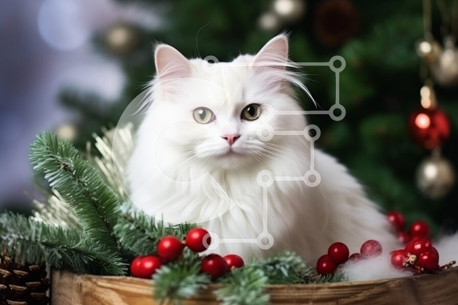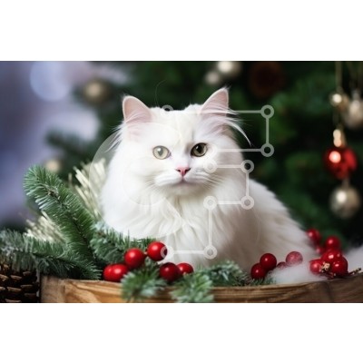 Υπάρχει δυνατότητα προσωποποίησης με δική σας φωτογραφία και προσαρμογής διαστάσεων κατόπιν παραγγελίας. Το συγεκεριμενο Puzzle 10x10 cm – 25 κομμ παρουσιαζει Αυτή η εικόνα παρουσιάζει μια όμορφη λευκή γάτα με εντυπωσιακά πράσινα μάτια, φωλιασμένη ανάμεσα σε εορταστικές διακοσμήσεις, όπως κλαδιά πεύκου και κόκκινα μούρα. Το φόντο υποδηλώνει ένα θέμα διακοπών, με ένα χριστουγεννιάτικο δέντρο στολισ