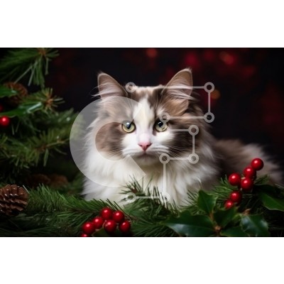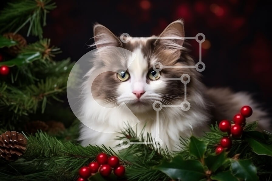 Υπάρχει δυνατότητα προσωποποίησης με δική σας φωτογραφία και προσαρμογής διαστάσεων κατόπιν παραγγελίας. Το συγεκεριμενο Puzzle 10x10 cm – 25 κομμ παρουσιαζει Αυτή η εικόνα απεικονίζει μια χνουδωτή γάτα με εντυπωσιακά πράσινα μάτια, φωλιασμένη ανάμεσα στο πράσινο των διακοπών. Η γάτα έχει ένα απαλό τρίχωμα με ένα μείγμα χρωμάτων, συμπεριλαμβανομένων λευκών και καφέ μπαλωμάτων. Γύρω από τη γάτα υπά