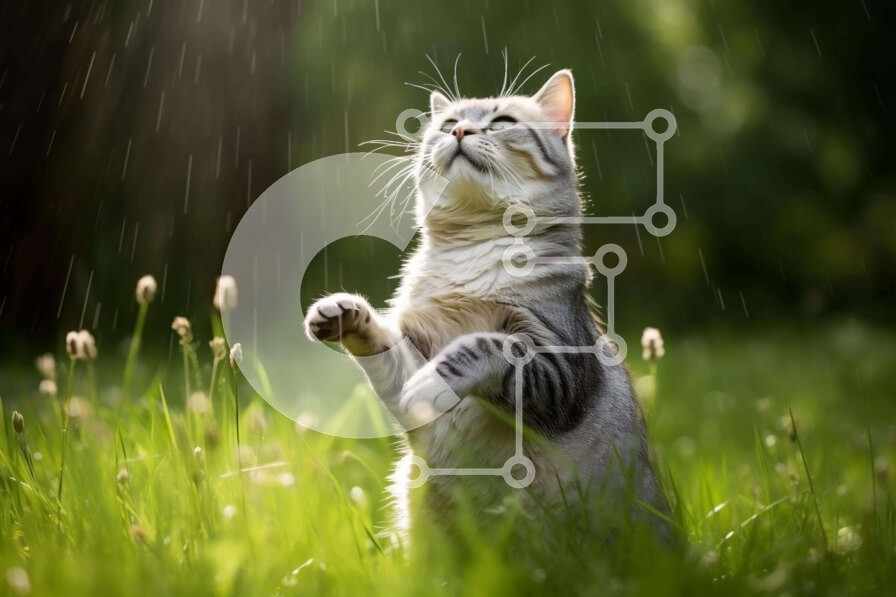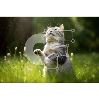 Υπάρχει δυνατότητα προσωποποίησης με δική σας φωτογραφία και προσαρμογής διαστάσεων κατόπιν παραγγελίας. Το συγεκεριμενο Puzzle 10x10 cm – 25 κομμ παρουσιαζει Η εικόνα δείχνει μια γκρι και λευκή γάτα να στέκεται στα πίσω πόδια της στο γρασίδι, κοιτάζοντας ψηλά στον ουρανό. Είναι πιθανό η γάτα να απολαμβάνει τον βροχερό καιρό, καθώς φαίνεται να εκμεταλλεύεται τα βρεγμένα χόρτα. Η γάτα μπορεί επίσης