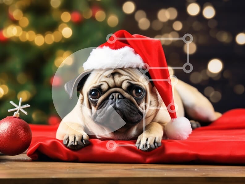 Υπάρχει δυνατότητα προσωποποίησης με δική σας φωτογραφία και προσαρμογής διαστάσεων κατόπιν παραγγελίας. Το συγεκεριμενο Puzzle 10x10 cm – 25 κομμ παρουσιαζει Αυτή η εικόνα παρουσιάζει ένα σκυλί πατημασιά που φορά ένα καπέλο Άγιου Βασίλη, ξαπλωμένο σε ένα κόκκινο πανί με εορταστικό φόντο με χριστουγεννιάτικα φώτα. Το πατημασιά έχει μια περίεργη έκφραση, με τα μεγάλα, εκφραστικά μάτια του να τραβού