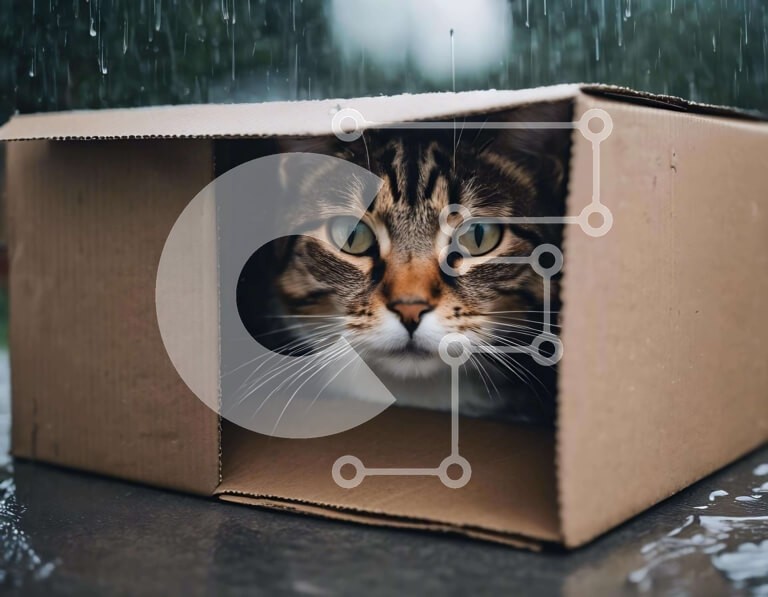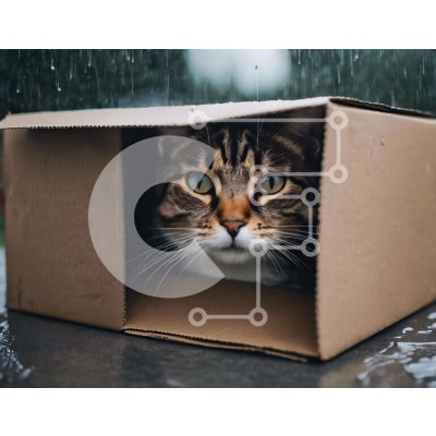 Υπάρχει δυνατότητα προσωποποίησης με δική σας φωτογραφία και προσαρμογής διαστάσεων κατόπιν παραγγελίας. Το συγεκεριμενο Puzzle 10x10 cm – 25 κομμ παρουσιαζει Η εικόνα δείχνει μια καφέ και λευκή γάτα που κρυφοκοιτάει από ένα ανοιχτό χαρτόκουτο στη βροχή. Φαίνεται ότι η γάτα αναζητά καταφύγιο από τον υγρό καιρό, επιδεικνύοντας το φυσικό της ένστικτο να βρει προστασία από τα στοιχεία. Ένα μοναδικό