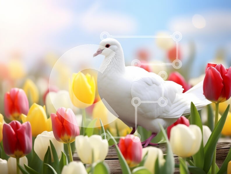 Υπάρχει δυνατότητα προσωποποίησης με δική σας φωτογραφία και προσαρμογής διαστάσεων κατόπιν παραγγελίας. Το συγεκεριμενο Puzzle 10x10 cm – 25 κομμ παρουσιαζει Η εικόνα απεικονίζει ένα λευκό περιστέρι να στέκεται με χάρη ανάμεσα σε ένα ζωντανό πεδίο με τουλίπες σε διάφορα χρώματα, όπως κόκκινο, κίτρινο και λευκό. Η σκηνή φωτίζεται από το ζεστό φως του ήλιου, δημιουργώντας μια γαλήνια και γραφική ατ