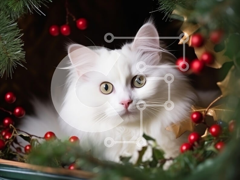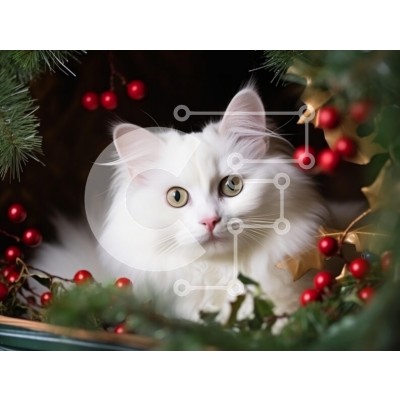 Υπάρχει δυνατότητα προσωποποίησης με δική σας φωτογραφία και προσαρμογής διαστάσεων κατόπιν παραγγελίας. Το συγεκεριμενο Puzzle 10x10 cm – 25 κομμ παρουσιαζει Η εικόνα απεικονίζει μια χνουδωτή λευκή γάτα με εντυπωσιακά κίτρινα μάτια, φωλιασμένη ανάμεσα σε εορταστικές διακοσμήσεις. Η γάτα περιβάλλεται από πράσινο φύλλωμα και κόκκινα μούρα, δημιουργώντας μια ζεστή ατμόσφαιρα με θέμα τις διακοπές. Η