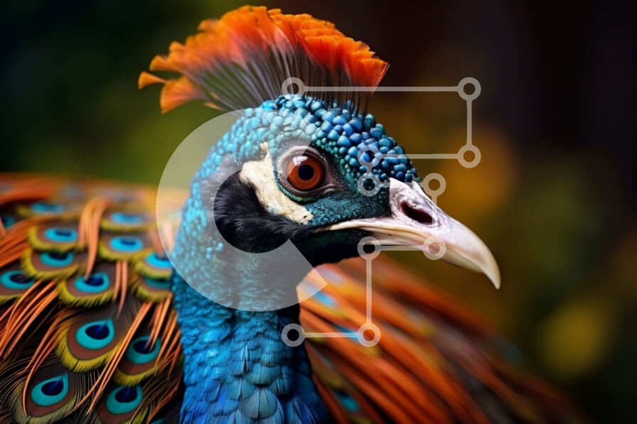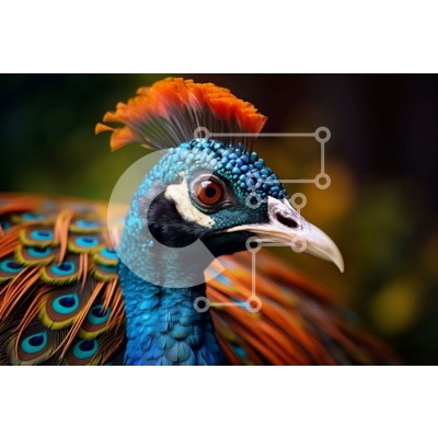 Υπάρχει δυνατότητα προσωποποίησης με δική σας φωτογραφία και προσαρμογής διαστάσεων κατόπιν παραγγελίας. Το συγεκεριμενο Puzzle 10x10 cm – 25 κομμ παρουσιαζει Αυτή η εικόνα είναι μια κοντινή όψη του κεφαλιού ενός παγωνιού. Το πουλί έχει έντονα χρωματιστά φτερά σε ένα ζωηρό μπλε, πράσινο και πορτοκαλί χρωματικό σχέδιο. Τα μάτια του είναι βαθύ καφέ και το ράμφος του είναι ανοιχτό γκρι. Τα φτερά στο