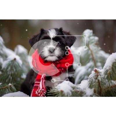Υπάρχει δυνατότητα προσωποποίησης με δική σας φωτογραφία και προσαρμογής διαστάσεων κατόπιν παραγγελίας. Το συγεκεριμενο Puzzle 10x10 cm – 25 κομμ παρουσιαζει Η εικόνα δείχνει ένα αξιολάτρευτο κουτάβι που κάθεται ανάμεσα σε κλαδιά πεύκου καλυμμένα με χιόνι. Το κουτάβι, με ασπρόμαυρο παλτό, φοράει ένα έντονο κόκκινο φουλάρι που κάνει αντίθεση με το χειμωνιάτικο σκηνικό. Οι νιφάδες χιονιού πέφτουν α