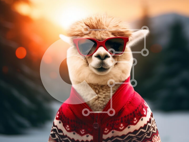 Υπάρχει δυνατότητα προσωποποίησης με δική σας φωτογραφία και προσαρμογής διαστάσεων κατόπιν παραγγελίας. Το συγεκεριμενο Puzzle 10x10 cm – 25 κομμ παρουσιαζει Η εικόνα απεικονίζει μια λάμα ντυμένη με ένα εορταστικό ερυθρόλευκο πουλόβερ, φορώντας κομψά κόκκινα γυαλιά ηλίου. Το σκηνικό δείχνει ένα ζεστό ηλιοβασίλεμα που φωτίζει ένα δάσος στο βάθος. Η λάμα αποπνέει μια ιδιόμορφη και χιουμοριστική γοη