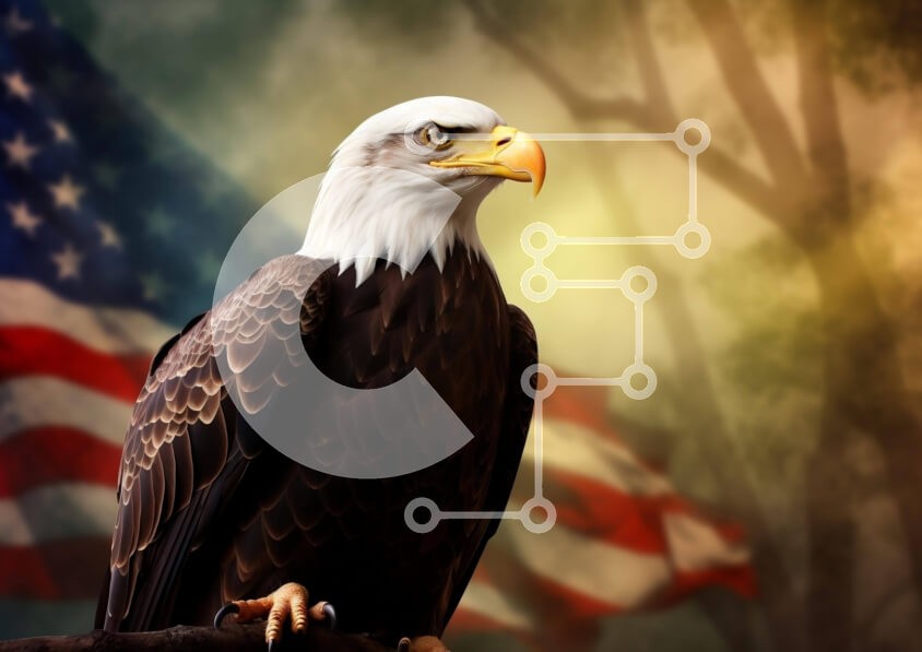 Υπάρχει δυνατότητα προσωποποίησης με δική σας φωτογραφία και προσαρμογής διαστάσεων κατόπιν παραγγελίας. Το συγεκεριμενο Puzzle 10x10 cm – 25 κομμ παρουσιαζει Η εικόνα δείχνει έναν μεγαλοπρεπή αετό σκαρφαλωμένο σε ένα κλαδί δέντρου με την αμερικανική σημαία στο βάθος. Το κεφάλι του αετού γέρνει προς την κάμερα, δίνοντας την εντύπωση ότι κοιτάζει κατευθείαν τον θεατή. Το έντονο βλέμμα του στην απόσ