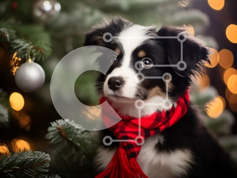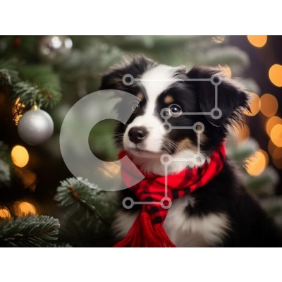 Υπάρχει δυνατότητα προσωποποίησης με δική σας φωτογραφία και προσαρμογής διαστάσεων κατόπιν παραγγελίας. Το συγεκεριμενο Puzzle 10x10 cm – 25 κομμ παρουσιαζει Αυτή η εικόνα παρουσιάζει ένα αξιολάτρευτο κουτάβι που κάθεται δίπλα σε ένα χριστουγεννιάτικο δέντρο στολισμένο με φώτα και στολίδια. Το κουτάβι έχει ένα χνουδωτό ασπρόμαυρο παλτό με εκφραστικά μάτια και είναι τυλιγμένο με ένα έντονο κόκκινο