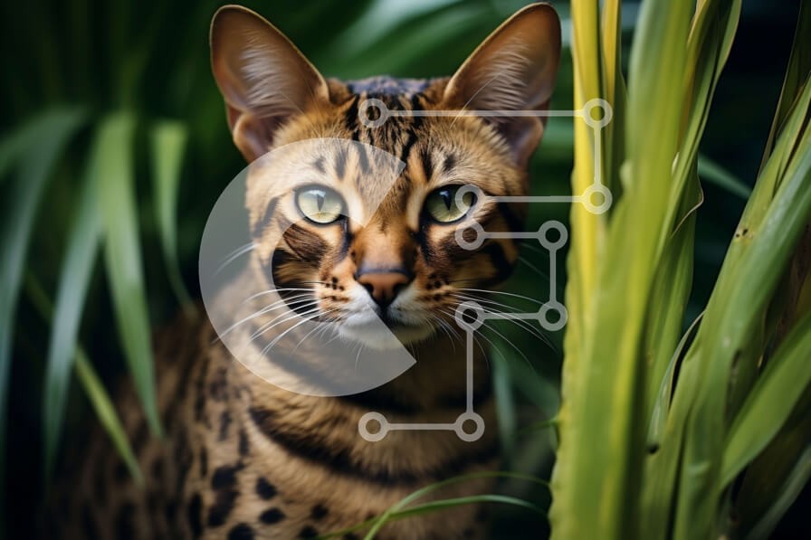 Υπάρχει δυνατότητα προσωποποίησης με δική σας φωτογραφία και προσαρμογής διαστάσεων κατόπιν παραγγελίας. Το συγεκεριμενο Puzzle 10x10 cm – 25 κομμ παρουσιαζει Αυτή η εικόνα παρουσιάζει μια γάτα της Βεγγάλης που κάθεται σε ένα καταπράσινο περιβάλλον ζούγκλας. Η γάτα έχει ένα μείγμα από καφέ και μαύρες ρίγες και λαμπερά πράσινα μάτια. Κοιτάζει κατευθείαν την κάμερα με μια περίεργη έκφραση. Το φόντο