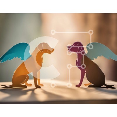 Υπάρχει δυνατότητα προσωποποίησης με δική σας φωτογραφία και προσαρμογής διαστάσεων κατόπιν παραγγελίας. Το συγεκεριμενο Puzzle 10x10 cm – 25 κομμ παρουσιαζει Αυτή η εικόνα παρουσιάζει δύο σκυλιά, ένα καφέ και ένα μπλε, να στέκονται σε μια ξύλινη επιφάνεια. Έχουν φτερά κολλημένα στην πλάτη τους και αιχμαλωτίζονται σε μια στιγμή περιέργειας καθώς κοιτάζουν ο ένας τον άλλον. Είναι μια ιδιότροπη σκην
