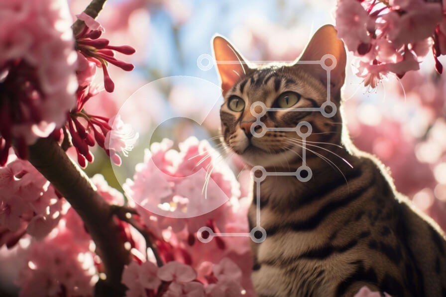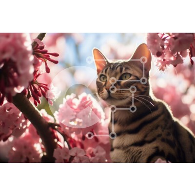 Υπάρχει δυνατότητα προσωποποίησης με δική σας φωτογραφία και προσαρμογής διαστάσεων κατόπιν παραγγελίας. Το συγεκεριμενο Puzzle 10x10 cm – 25 κομμ παρουσιαζει Η εικόνα δείχνει μια γάτα της Βεγγάλης να κάθεται στη μέση μερικών ροζ ανθών. Η γάτα κοιτάζει ψηλά την κάμερα, η οποία φαίνεται μέσα από τα κλαδιά που την περιβάλλουν. Φαίνεται να απολαμβάνει το περιβάλλον του, ίσως σκαρφαλωμένο στην κορυφή