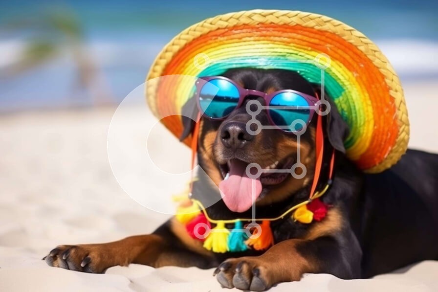 Υπάρχει δυνατότητα προσωποποίησης με δική σας φωτογραφία και προσαρμογής διαστάσεων κατόπιν παραγγελίας. Το συγεκεριμενο Puzzle 10x10 cm – 25 κομμ παρουσιαζει Ένα χαρούμενο σκυλί rottweiler που φοράει πολύχρωμο καπέλο σομπρέρο και γυαλιά ηλίου, χαλαρώνει στην παραλία με τον ιδιοκτήτη του. Ο σκύλος εμφανίζεται χαρούμενος και άνετος, απολαμβάνοντας το ηλιόλουστο εξωτερικό περιβάλλον. Αυτή η σκηνή με