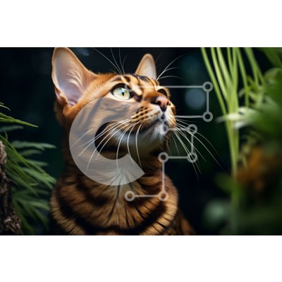 Υπάρχει δυνατότητα προσωποποίησης με δική σας φωτογραφία και προσαρμογής διαστάσεων κατόπιν παραγγελίας. Το συγεκεριμενο Puzzle 10x10 cm – 25 κομμ παρουσιαζει Αυτή η εικόνα παρουσιάζει μια γάτα της Βεγγάλης που κάθεται σε ένα καταπράσινο περιβάλλον που μοιάζει με ζούγκλα. Η γάτα έχει ένα ριγέ παλτό με μαύρες και πορτοκαλί ρίγες και τα μάτια της έχουν έντονο πράσινο χρώμα. Η γούνα του είναι αφράτη