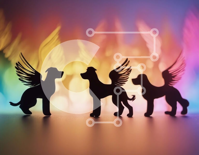 Υπάρχει δυνατότητα προσωποποίησης με δική σας φωτογραφία και προσαρμογής διαστάσεων κατόπιν παραγγελίας. Το συγεκεριμενο Puzzle 10x10 cm – 25 κομμ παρουσιαζει Αυτή η εικόνα παρουσιάζει τρεις σιλουέτες σκύλων με φτερά στην πλάτη τους που στέκονται μπροστά σε ένα πολύχρωμο και δυναμικό φόντο. Τα σκυλιά είναι σε μια σειρά, με τα φτερά τους ανοιχτά πίσω τους. Τα φτερά είναι μακριά και μυτερά, που μοιά