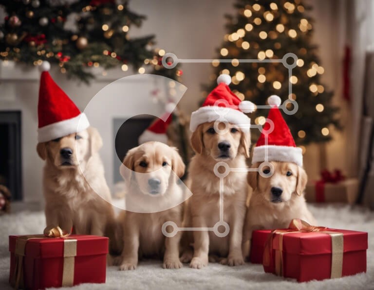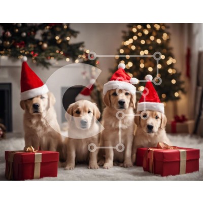Υπάρχει δυνατότητα προσωποποίησης με δική σας φωτογραφία και προσαρμογής διαστάσεων κατόπιν παραγγελίας. Το συγεκεριμενο Puzzle 10x10 cm – 25 κομμ παρουσιαζει Αυτή η εικόνα παρουσιάζει τέσσερα σκυλιά Γκόλντεν Ριτρίβερ που φορούν καπέλα Άγιου Βασίλη, να κάθονται μπροστά από ένα χριστουγεννιάτικο δέντρο. Τα σκυλιά είναι τοποθετημένα στο πάτωμα, με τα κεφάλια τους γερμένα προς την κάμερα. Γύρω τους υ