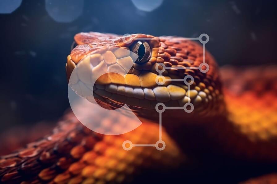 Υπάρχει δυνατότητα προσωποποίησης με δική σας φωτογραφία και προσαρμογής διαστάσεων κατόπιν παραγγελίας. Το συγεκεριμενο Puzzle 10x10 cm – 25 κομμ παρουσιαζει Αυτή η εικόνα είναι ένα κοντινό πλάνο του κεφαλιού ενός φιδιού με φωτεινά πορτοκαλί μάτια και ορατούς κυνόδοντες. Το σώμα του φιδιού είναι κουλουριασμένο και η γλώσσα του κρέμεται έξω από το στόμα του. Το φόντο είναι σκοτεινό και θολό, δίνον