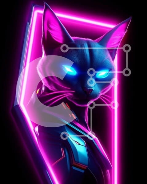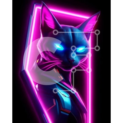 Υπάρχει δυνατότητα προσωποποίησης με δική σας φωτογραφία και προσαρμογής διαστάσεων κατόπιν παραγγελίας. Το συγεκεριμενο Puzzle 10x10 cm – 25 κομμ παρουσιαζει Αυτή η εικόνα παρουσιάζει μια στυλιζαρισμένη απεικόνιση μιας γάτας με λαμπερά μπλε μάτια, που τονίζονται από ζωντανά ροζ νέον και μπλε χρώματα. Η γάτα φαίνεται να φοράει φουτουριστική πανοπλία, η οποία προσθέτει μια αισθητική επιστημονικής φ