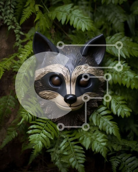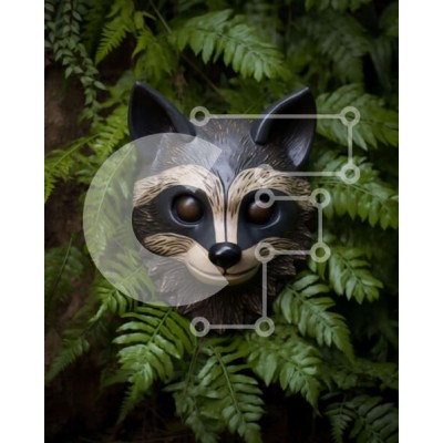 Υπάρχει δυνατότητα προσωποποίησης με δική σας φωτογραφία και προσαρμογής διαστάσεων κατόπιν παραγγελίας. Το συγεκεριμενο Puzzle 10x10 cm – 25 κομμ παρουσιαζει Η εικόνα δείχνει μια ξύλινη μάσκα ρακούν τοποθετημένη πάνω από ζωντανά πράσινα φυτά στο προσκήνιο. Η μάσκα, περίπλοκα κατασκευασμένη από ξύλο, προσθέτει μια πινελιά ιδιοτροπίας και μπορεί να είναι μέρος μιας φορεσιάς ζώων ή διακοσμητικού κομ