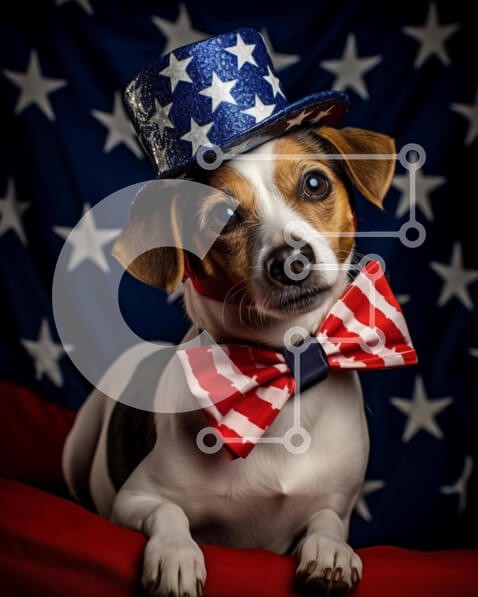 Υπάρχει δυνατότητα προσωποποίησης με δική σας φωτογραφία και προσαρμογής διαστάσεων κατόπιν παραγγελίας. Το συγεκεριμενο Puzzle 10x10 cm – 25 κομμ παρουσιαζει Η εικόνα απεικονίζει ένα μικρό σκυλί που φορά ένα καπέλο και παπιγιόν με θέμα την αμερικανική σημαία. Ο σκύλος είναι ξαπλωμένος στο κόκκινο, λευκό και μπλε φόντο με το κεφάλι του ακουμπισμένο πάνω από το πανό με τα αστέρια στο βάθος. Φαίνετα
