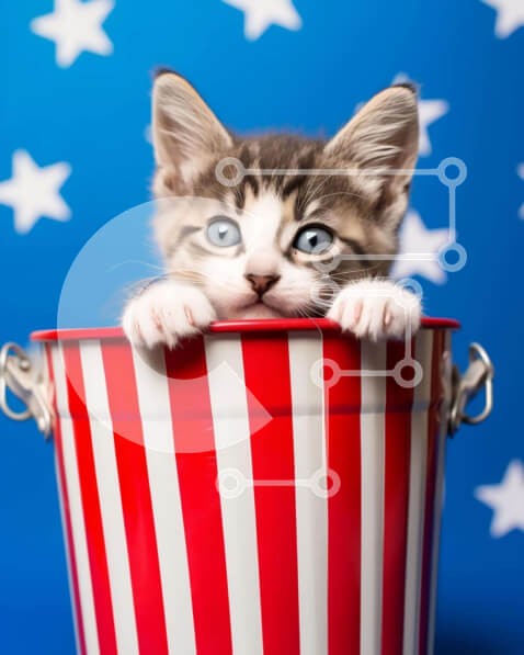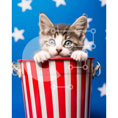Υπάρχει δυνατότητα προσωποποίησης με δική σας φωτογραφία και προσαρμογής διαστάσεων κατόπιν παραγγελίας. Το συγεκεριμενο Puzzle 10x10 cm – 25 κομμ παρουσιαζει Αυτή η εικόνα απαθανατίζει μια ευχάριστη στιγμή με ένα μικρό γκρι και λευκό γατάκι να κρυφοκοιτάει από έναν κόκκινο, λευκό και μπλε κουβά με αστέρια. Το περίεργο γατάκι φαίνεται να απολαμβάνει την ώρα του και να κοιτάζει την κάμερα με αθωότη